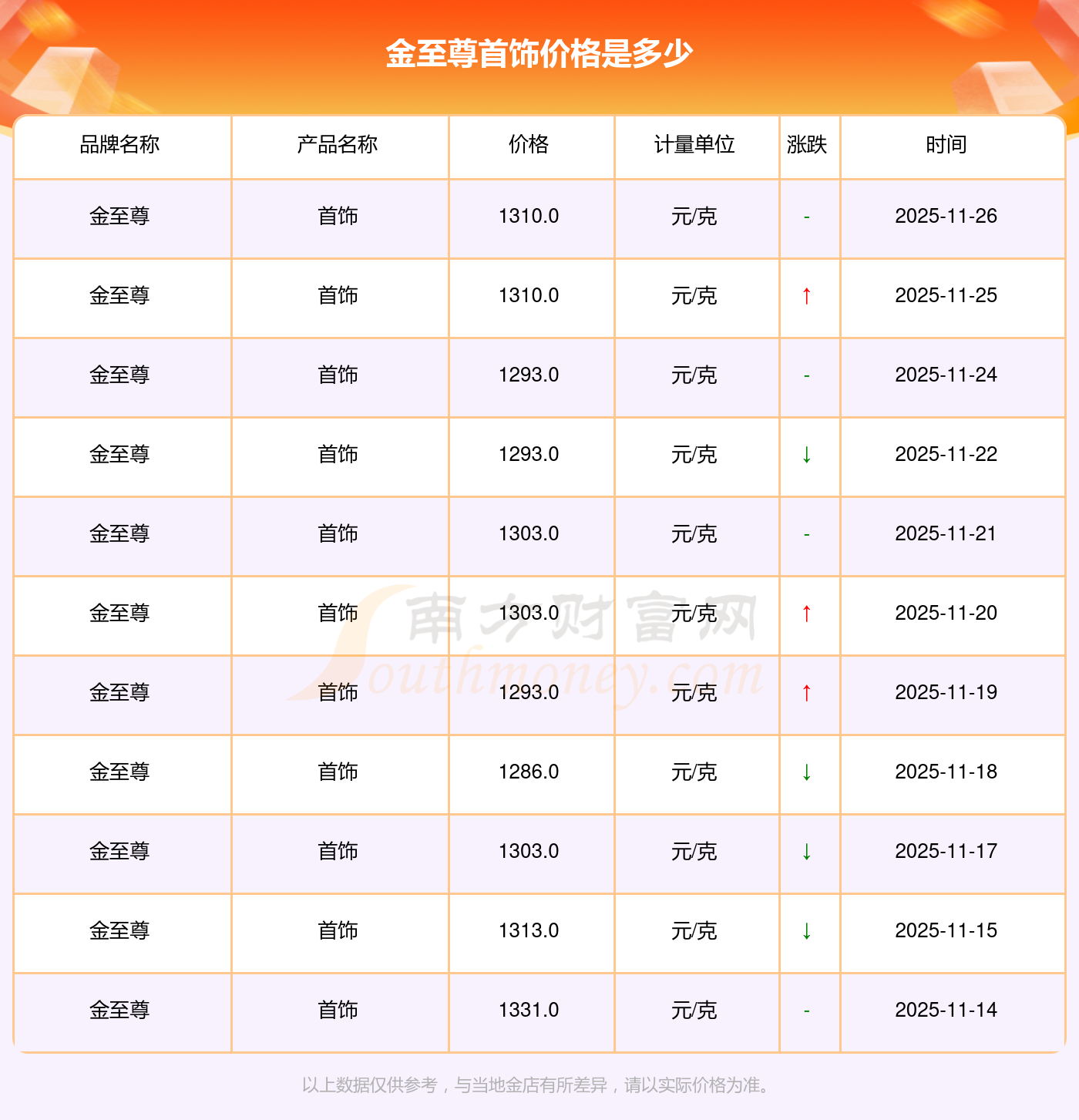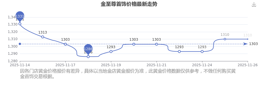 今日(2025年11月27日),金至尊首饰最新价格是1310.0元/克。
