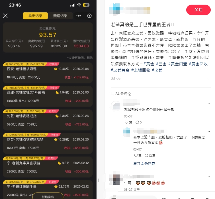 另一方面,有网民在交际平台上晒出“战绩”,卖出老铺黄金产品予收回商仍能大赚。该网民上一年买了许多老铺黄金的产品,并于本年连续卖出予二手商,例如18,788元买入老铺福袋项圈,以20,300元卖出;红珊瑚手串则以27,000元买入,以28,500元卖出,从2月12日开端到3月4日,一共卖出6件,累计收益5,534元。